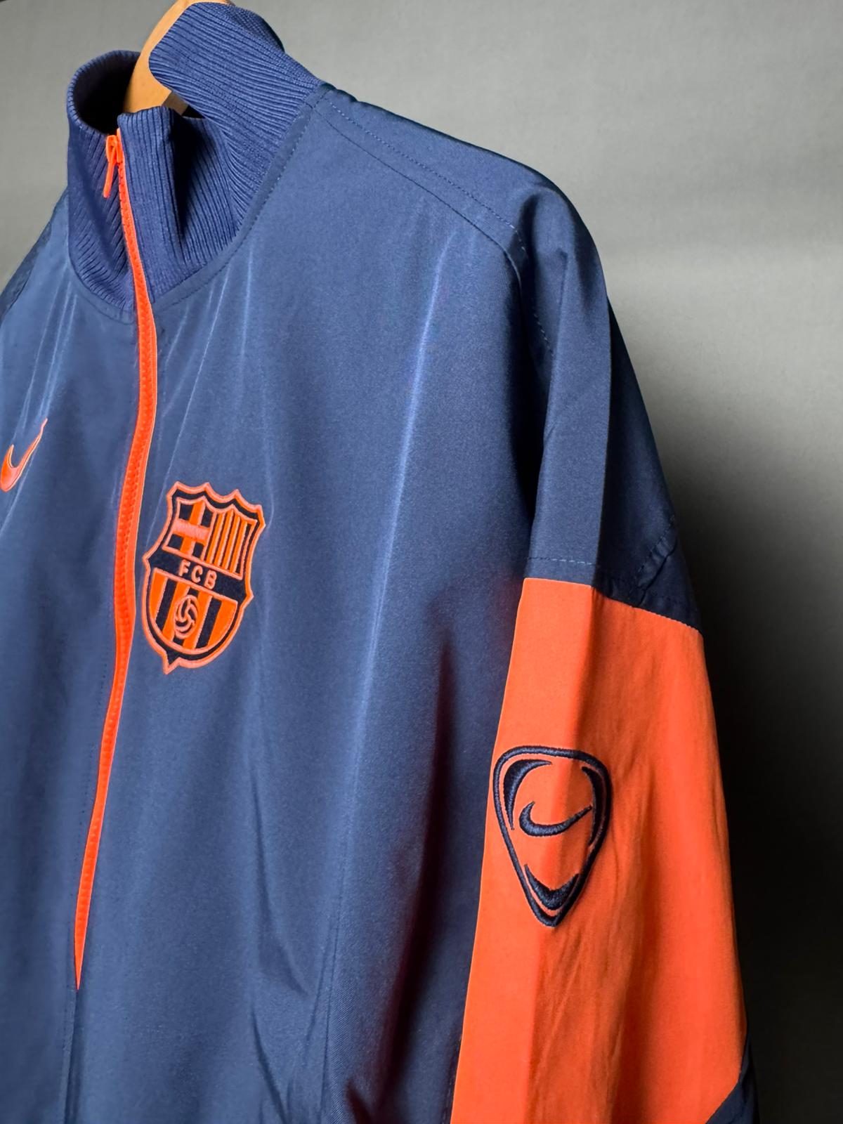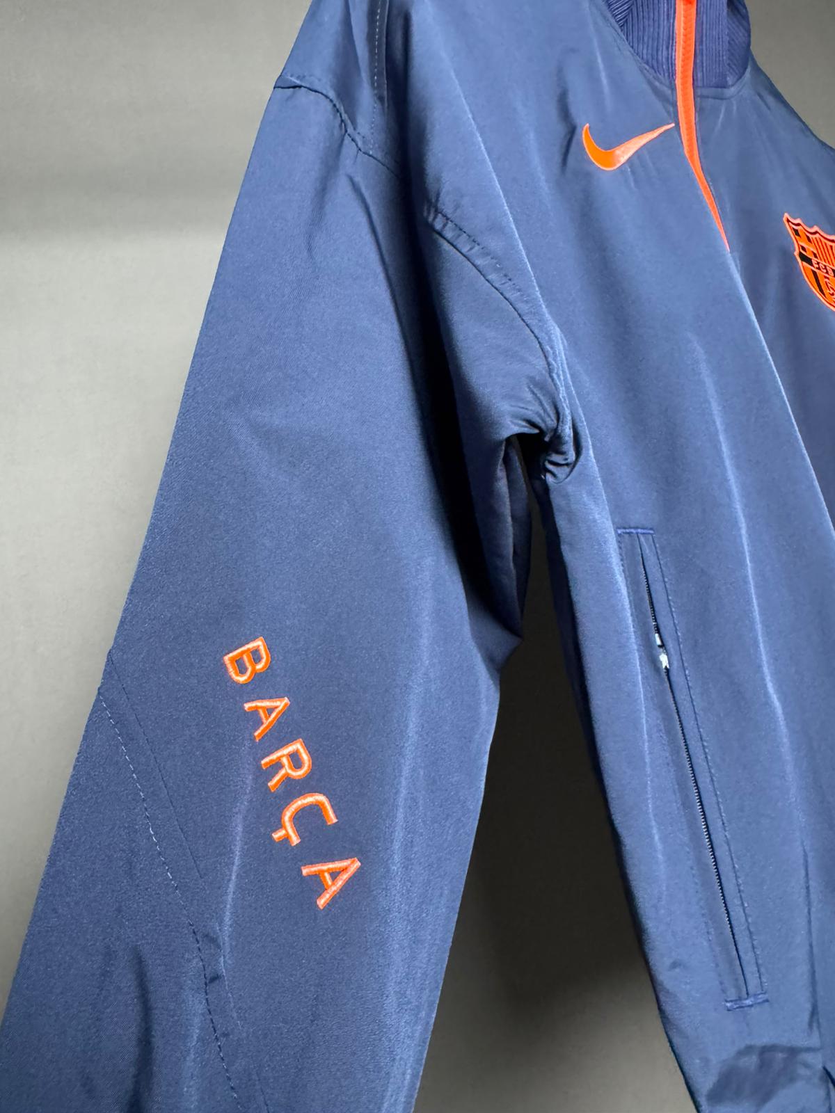 جكيت برشلونة لموسم 25/26 مصنوع من النايلون المقاوم للماء بلونه الاسود المميز