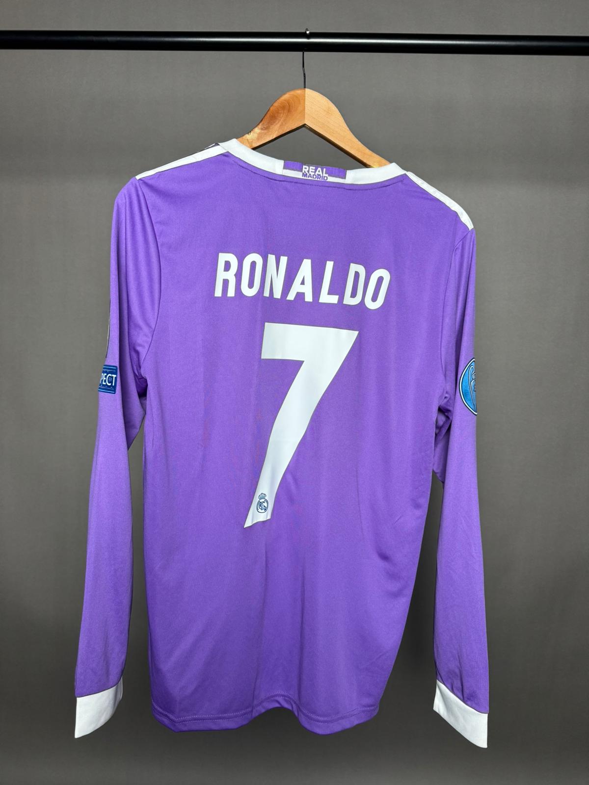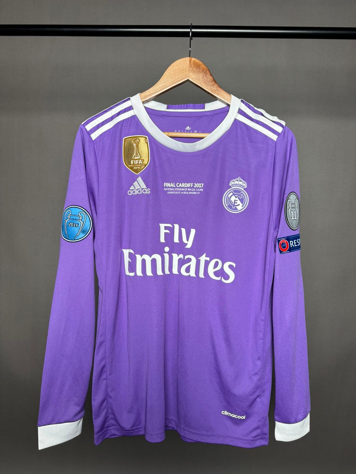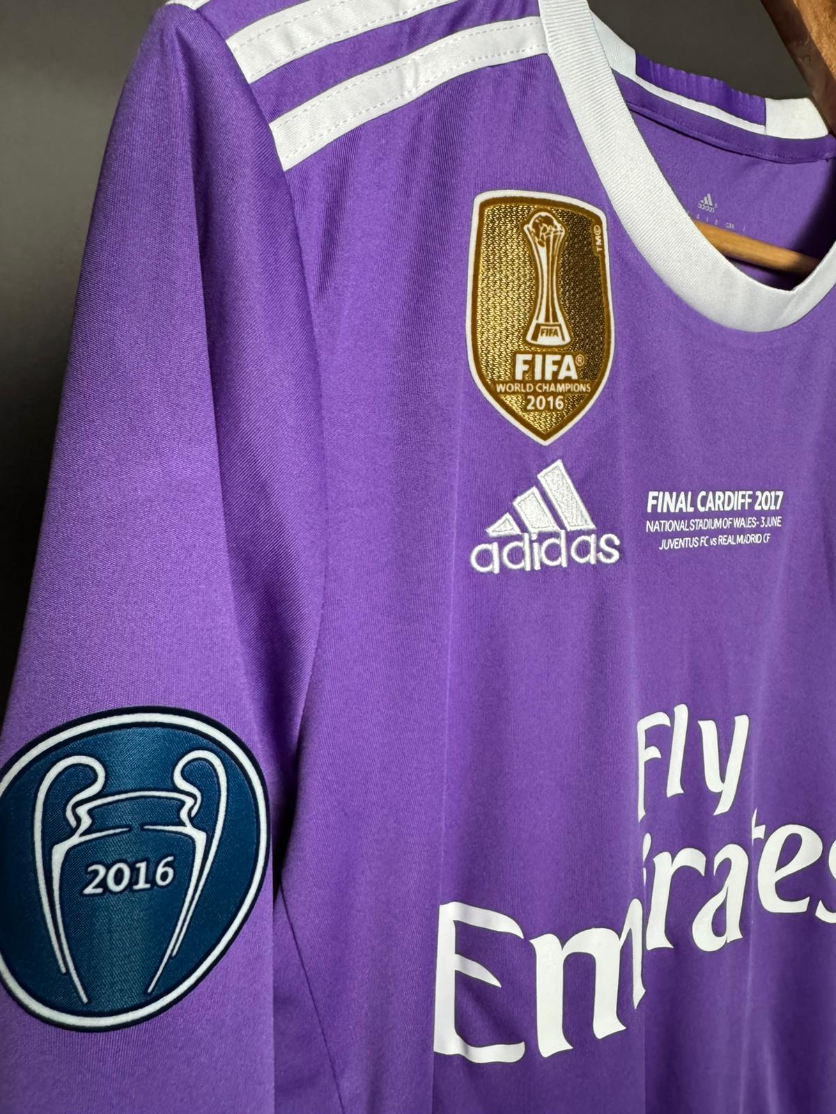 تيشيرت ريال مدريد الزي الاحتياطي بملصقات نهائي دوري أبطال اوروبا لموسم 2017 ريترو بالأكمام الطويلة