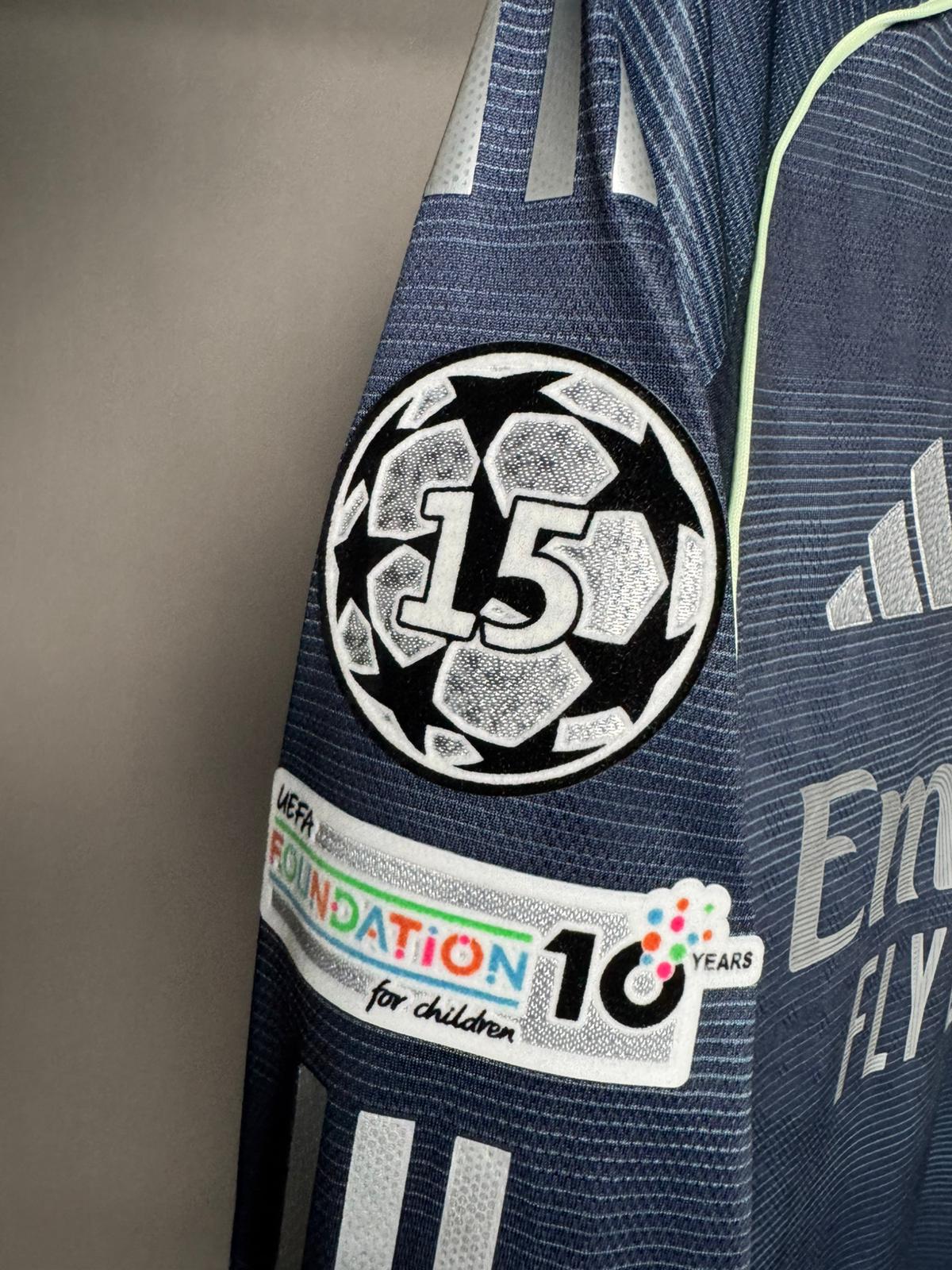 بالوصف اكتب : تيشيرت ريال مدريد الزي الاحتياطي بملصقات دوري أبطال اوروبا لموسم 25/26 بالأكمام الطويلة بنسخة اللاعبين .
